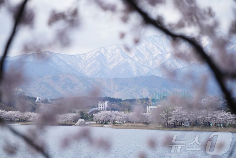 14일 강원 속초지역 대표 벚꽃 명소인 영랑호 일대에 핀 벚꽃 뒤로 설악산에 전날 내린 눈이 쌓여 있어 이색적인 풍경을 자아내고 있다.(속초시 제공, 재판매 및 DB 금지) 2025.4.14/뉴스1 ⓒ News1 윤왕근 기자 |