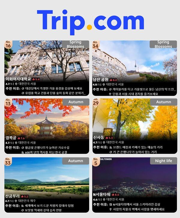 한국은 계절 테마 랭킹에서 두각을 나타냈다. 봄꽃 명소에는 ‘이화여대’와 ‘남산공원’이, 가을 단풍 명소에는 ‘경복궁’, ‘신사동’, ‘남산공원’이 이름을 올렸다. 사계절이 뚜렷한 한국의 자연환경이 글로벌 여행자들에게 매력적인 요소로 작용하고 있다는 방증으로 해석된다.