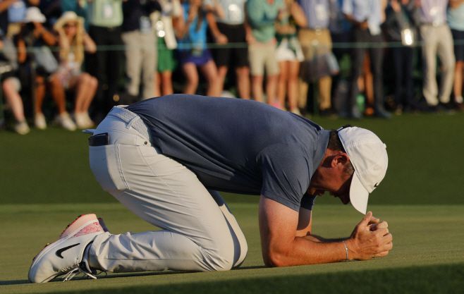 로리 매킬로이가 지난 13일(현지시간) PGA 투어 마스터스에서 우승이 확정된 순간 무릎을 꿇고 기뻐하고 있다. /로이터 연합뉴스