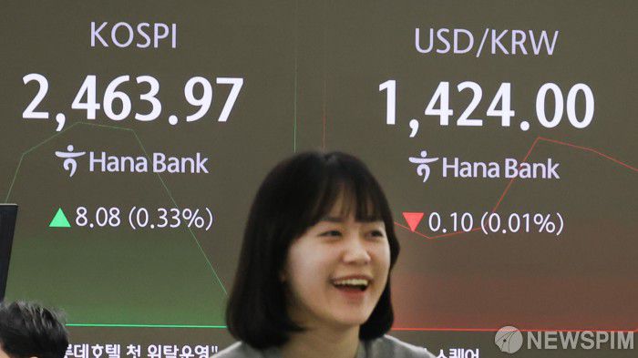 [서울=뉴스핌] 양윤모 기자 = 트럼프의 스마트폰과 컴퓨터에 대한 '상호관세' 완화가 발표된 15일 오전 코스피 지수가 전 거래일 종가보다 8.64포인트(0.35%) 오른 2,464.53으로, 코스닥 지수는 1.78포인트(0.25%) 내린 707.20로 거래를 시작했다. 서울 외환시장에서 원/달러 환율은 전 거래일보다 0.40원 내린 1,423.70원에 거래되는 가운데, 서울 중구 하나은행 딜링룸에서 직원들이 업무를 보고 있다. 2025.04.15 yym58@newspim.com