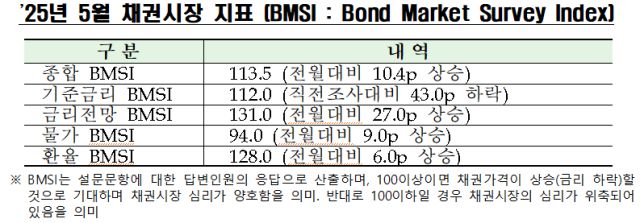 이러한 조사 결과를 토대로 산출한 5월 채권시장 종합 BMSI는 113.5로 전월(103.1) 대비 10.4포인트 상승했다. BMSI는 채권시장 심리를 나타내는 것으로 100 이상이면 채권금리 하락(가격 상승)이 기대되는 등 시장 심리가 양호하다는 것을 의미한다.