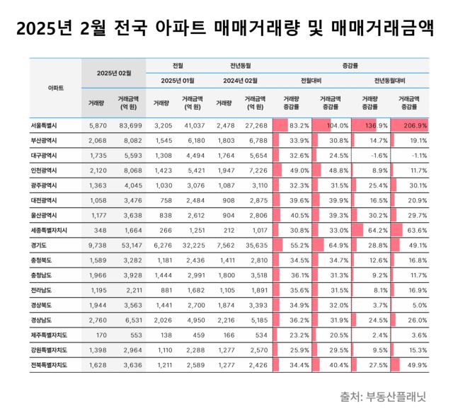 2월 전국에서 발생한 아파트 거래량은 3만 8127건으로 직전월(2만 6081건) 대비 46.2% 상승했다. 거래금액은 11조 8875억 원에서 66.6% 오른 19조 8078억 원으로 집계됐다. 2024년 2월(2만 9791건, 11조 4708억 원)과 비교하면 각각 28.0%, 72.7% 증가한 수치다.