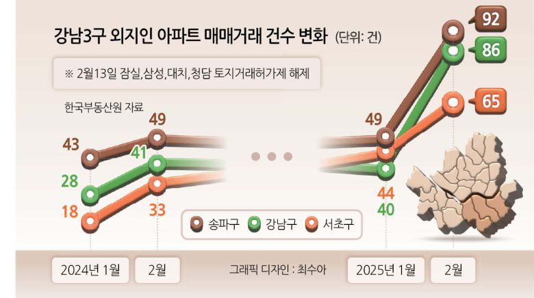 토지거래허가제(토허제) 해제와 함께 서울 송파구의 외지인 거래가 한 달 사이 2배로 늘어난 것으로 나타났다. 다만 외지인 매수자의 비중은 전년 동월 대비 감소했다. 거래량 급증 속에서도 서울 내 상급지 갈아타기 수요가 존재감을 발휘한 것으로 보인다.