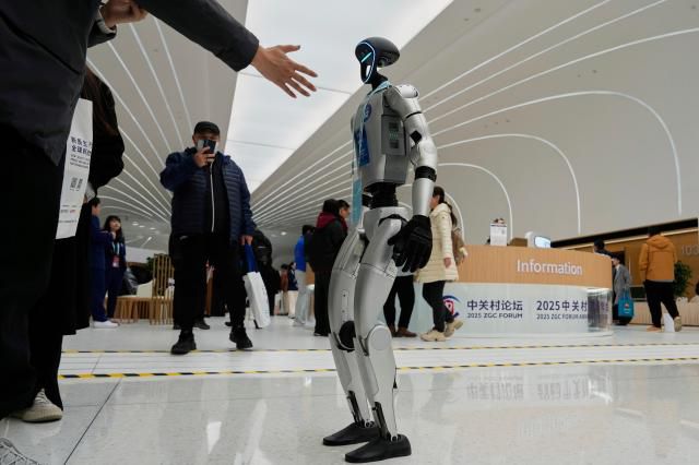 3월 28일 중국 베이징 중관춘국제혁신센터에서 열린 ‘2025 중관춘 포럼’에서 한 방문객이 유니트리 휴머노이드로봇 ‘G1’과 악수하기 위해 손을 내밀고 있다. [사진=AP연합뉴스] |
