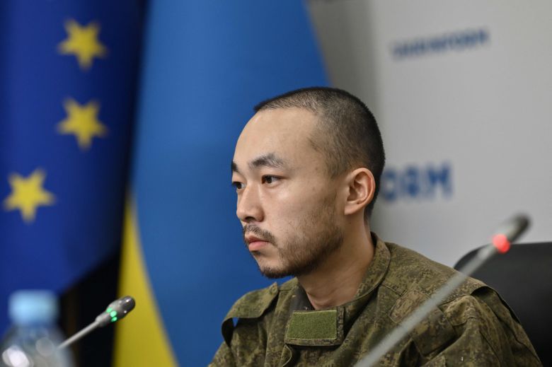 우크라이나 도네츠크 지역에서 포로로 붙잡힌 러시아군 중국 용병 장런보가 14일(현지시간) 우크라이나 키이우에서 보안국 주최로 열린 기자회견에 참석해 발언하고 있다. AFP연합뉴스 |