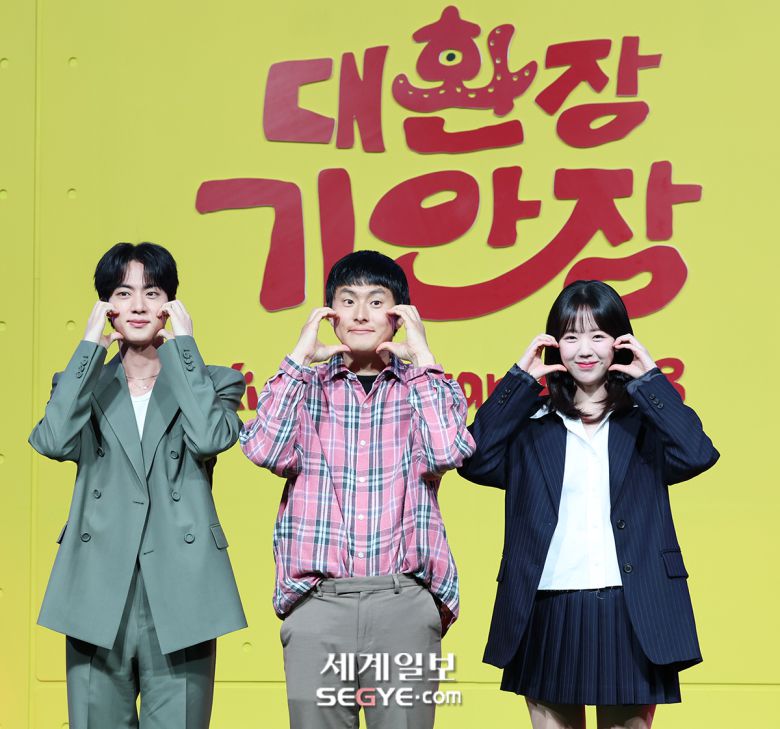 그룹 BTS 진, 방송인 기안84, 배우 지예은(사진 왼쪽부터)이 15일 서울 종로구 JW 메리어트 동대문 스퀘어 서울에서 열린 넷플릭스 리얼리티 '대환장 기안장 part2 절찬리 영업중' 기자간담회에 참석해 포즈를 취하고 있다.