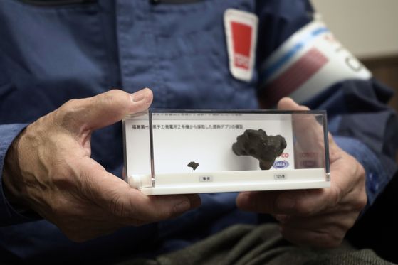 도쿄전력의 원전 폐로 책임자 아키라 오노가 지난해 후쿠시마 제1원자력발전소에서 추출된 핵연료 잔해의 모형을 들고 있다. AP=연합뉴스 |