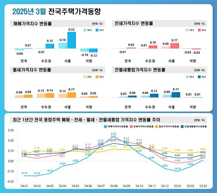 15일 한국부동산원이 발표한 '2025년 3월 전국주택가격동향조사' 결과에 따르면 전국 주택 매매가격지수는 0.01% 상승하며 전월(-0.06%) 대비 상승 전환됐다. 수도권(-0.01%→0.15%)도 상승 전환됐으며 서울(0.18%→0.52%)은 상승폭이 3배 가까이 커졌다.