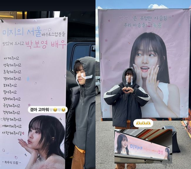 사진에는 ‘미지의 서울’ 촬영 중인 박보영이 누군가로부터 커피차를 받고 감동 받은 모습이 담겼다. 박보영에게 커피차를 보낸 사람은 다름아닌 ‘멜로무비’로 호흡을 맞춘 최우식이었다. 최우식은 “‘미지의 서울’ 배우, 스태프 분들 맛있게 드시고 박보영 배우 아껴주시고 성원해주시고 후원해주시고 격려해주시고 보태주시고 밀어주시고 염려해주시고 근심해주시고 걱정해주시고 칭찬해주시고 예뻐해주시고 사랑해주시길”이라는 응원 문구도 함께 적었다.