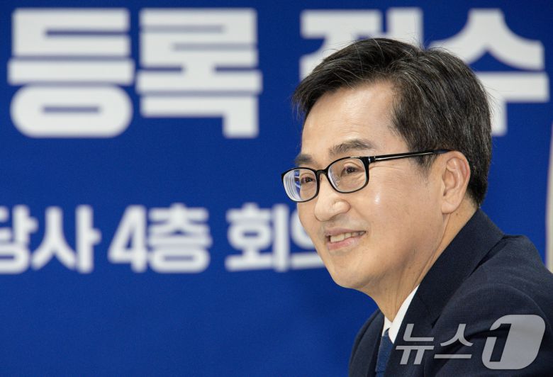 제21대 대통령선거에 출마를 선언한 김동연 경기도지사가 15일 오후 서울 여의도 더불어민주당 당사에 마련된 (예비)후보자 등록 접수처를 찾아 서류를 접수하고 있다. 2025.4.15/뉴스1 ⓒ News1 이재명 기자
