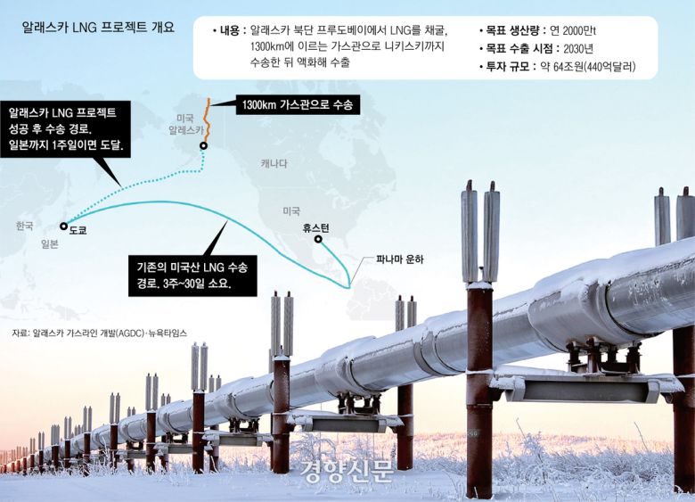 알래스카 LNG 프로젝트는 알래스카 북단 프루도베이의 가스전에서 채굴한 천연가스를 1300㎞에 이르는 수송관으로 운송해 액화한 뒤 수출하는 사업이다. 이 프로젝트는 앞서 트럼프 행정부 1기 때 연방에너지규제위원회(FERC) 승인을 받았지만 트럼프 대통령이 재선에 실패하면서 잠정 중단됐다.