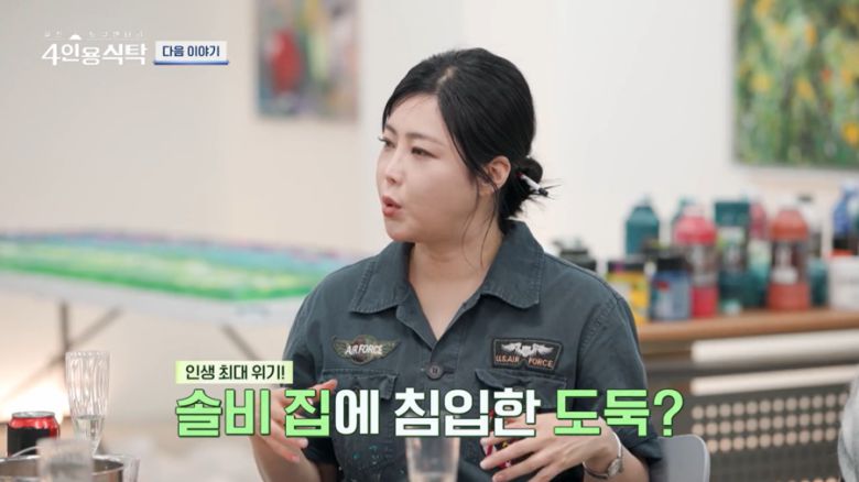 14일 방송된 채널A 예능 프로그램 '4인용식탁' 방송 말미에는 솔비의 다음주 출연분이 예고됐다. 해당 예고편에서 솔비는 집에 도둑이 들었던 사실을 공개했다.