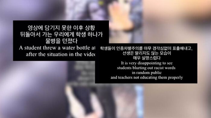 글쓴이는 이후 학생들 중 누군가가 자신에게 물병까지 던졌고 그 후로도 '칭챙총'이라고 야유를 계속했다면서, 계속 대응하는 건 위험할 것 같아서 현장을 떠났다고 전했습니다.