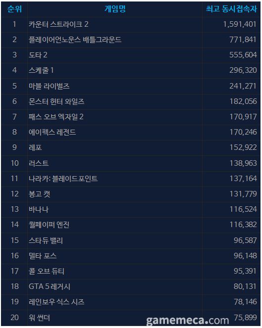 ▲ 4월 15일 오후 3시 기준 스팀 일 최고 동시접속자 수 TOP 20 (자료출처: 스팀)