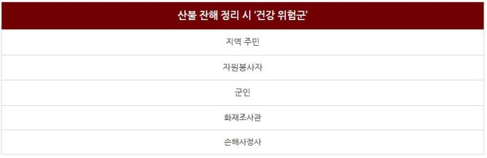 때문에 주민은 물론 △자원봉사자 △군인 △화재조사관 △손해사정사 등은 산불 잔해를 정리하거나 조사를 할 때 적절한 개인보호구를 착용하고 진행하는 것이 중요합니다.