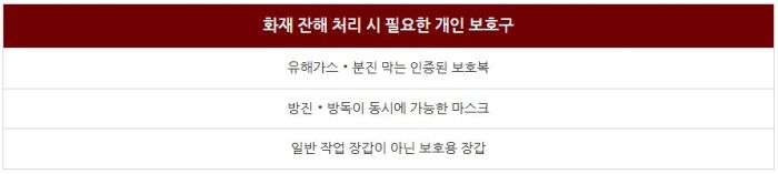 잔해 정리에 참여하는 사람 대부분이 보건용인 'KF(Korea Filter) 마스크’를 착용하지만, 이는 근본적인 해결책이 아닙니다. 미국의 경우 화재 후 집에 돌아갈 때 주민들에게 지침 가이드라인을 배포해서 교육합니다.