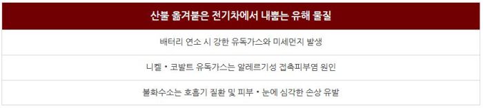 전기차 배터리가 연소되면서 많은 유해물질이 발생하며, 이는 진화 작업에 참여하는 인력에게 추가적인 위험 요소가 됩니다.
