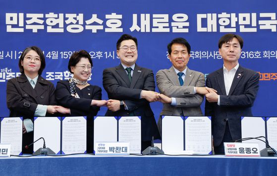 용혜인 기본소득당 대표(왼쪽부터), 김선민 조국혁신당 대표 권한대행, 박찬대 더불어민주당 대표 직무대행 겸 원내대표, 윤종오 진보당 상임대표 직무대행, 한창민 사회민주당 대표가 15일 오후 서울 여의도 국회에서 열린 내란종식 민주헌정수호 새로운 대한민국 원탁회의에 참석해 2차 선언문에 서명한 뒤 기념 촬영하고 있다. 야5당은 내란특검 실시, 반헌법행위 특별조사위원회 설치, 대선 직후 교섭단체 요건 완화를 마무리하고 결선투표제 도입, 권력기관 개혁 추진 등을 합의했다. 뉴스1
