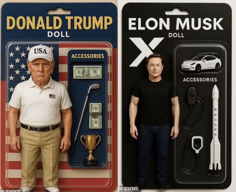[서울=뉴시스] 도널드 트럼프 미국 대통령과 일론 머스크 테슬라 최고경영자(CEO)의 바비코어 인형. (출처=데일리메일) 2025.04.14. photo@newsis.com *재판매 및 DB 금지 /사진=뉴시스                                    X(옛 트위터)에서 공유 중인 유명인사들의 바비 코어 이미지. X 캡처