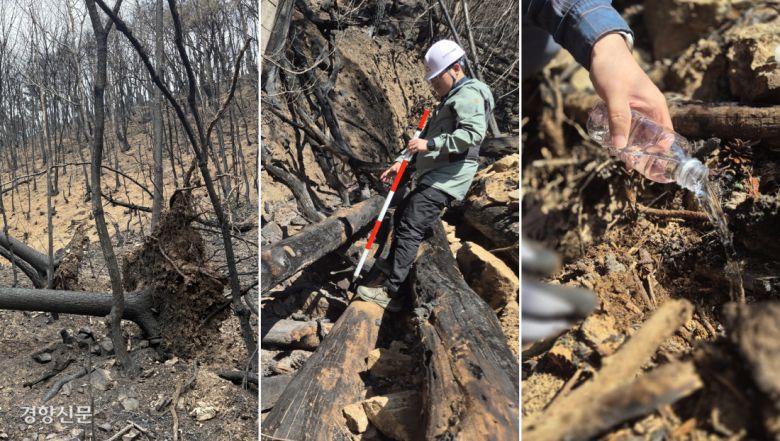 이곳 역시 산사태 가능성이 전보다 높아졌다. 생수를 땅에 흘려봤더니 스며들지 않고 경사로를 따라 줄줄 내려갔다. 박성균 한국치산기술협회 경남지부 팀장은 “폭우가 내리면 흙이 물을 감당하지 못하고 물 미끄럼틀처럼 흙, 나무를 싹 쓸어간다”며 “이대로 아무 작업도 하지 않는다면 곧 있을 장마철에 마을이 큰 피해를 보게 될 것”이라고 말했다. 이곳은 산불 이후 산사태 위험 진단 과정에서 응급복구 지역으로 지정됐다.