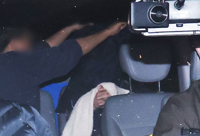 살인 혐의로 긴급 체포된 A씨는 이날 오후 8시 10분께 얼굴이 옷으로 가려진 채로 호송차를 타고 경기 용인서부경찰서에 도착했다.