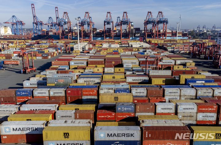 [함부르크=AP/뉴시스] 독일 함부르크항 전용부두에 선적을 기다리는 수출용 컨테이너가 줄지어 쌓여있다. 자료사진. 2025.04.15 |
