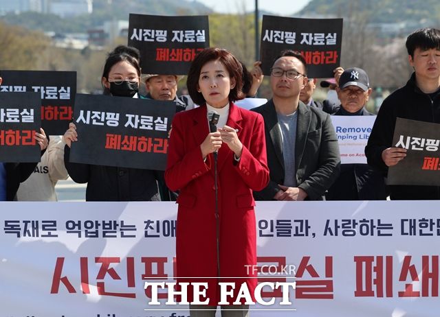 나경원 국민의힘 의원이 15일 오후 서울 관악구 서울대학교 정문 앞에서 서울대 트루스포럼이 주최한 시진핑 자료실 폐쇄촉구 기자회견에 참석해 지지발언을 하고 있다. /뉴시스 |