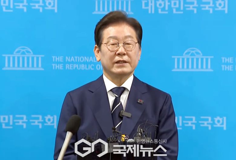 ▲이재명 더불어민주당 대선 예비후보는 11일 오전 국회에서 \'K-이니셔티브\' 비전을 발표 후 취재진들의 질문에 답변하고 있다./사진=원명국 기자 |