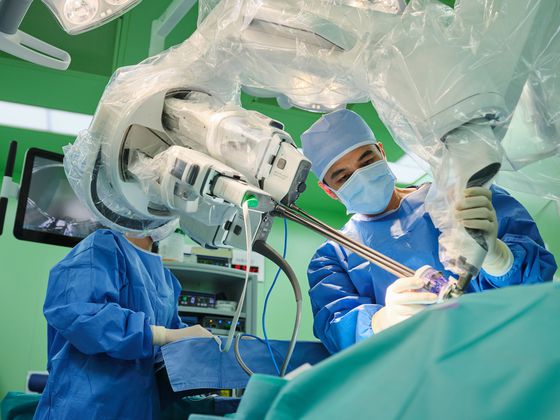 고대 구로병원 대장항문외과 강상희 교수가 로봇수술을 준비하고 있다. 대장암 환자 김정남씨는 대림성모병원에서 지난달 20일 샘암종 진단을 받고 강 교수에 의뢰됐다. 12일만인 이달 1일 수술받았다. 김씨는 ″급행 탄 것 같다″고 했다. [사진 고대 구로병원] |