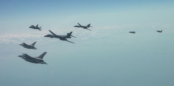 한·미 양국이 15일 한반도 상공에서 미국 전략폭격기 B-1B 랜서(오른쪽 첫째·둘째) 등이 참여한 공중훈련을 실시했다고 국방부가 밝혔다. 북핵 위협에 대응하기 위한 이번 훈련에는 공군 F-35A와 F-16, 미 F-16 전투기 등이 참여했다. [사진 국방부]