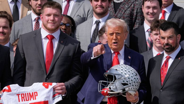 대학 미식축구 우승팀 헬멧 들고 도널드 트럼프 미국 대통령이 14일(현지 시간) 워싱턴 백악관에서 2025년 대학 미식축구 우승팀인 오하이오주립대 선수들과 기념 촬영을 하고 있다. 트럼프 대통령은 이날 “자동차 회사들을 돕기 위한 조치를 생각하고 있다”며 자동차 부품에 대한 관세 면제 가능성을 시사했다. 워싱턴=AP 뉴시스 |