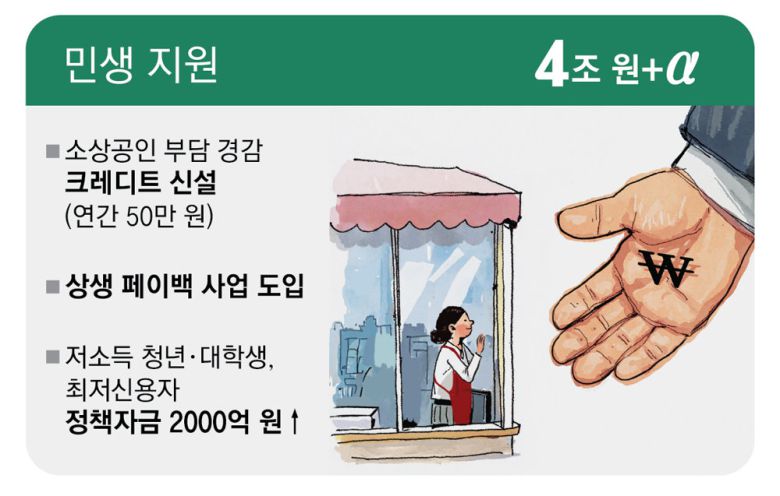 소상공인이 공공요금과 보험료 납부에 사용할 수 있는 연간 50만 원의 ‘부담경감 크레디트’도 신설될 예정이다. 연매출 30억 원 이하 사업자에게 사용한 전년 대비 카드 소비 증가분의 일부를 온누리상품권으로 환급하는 ‘상생페이백’ 사업도 새로 추진된다. 이 사업들을 비롯한 민생 지원에 최소 4조 원이 투입된다.