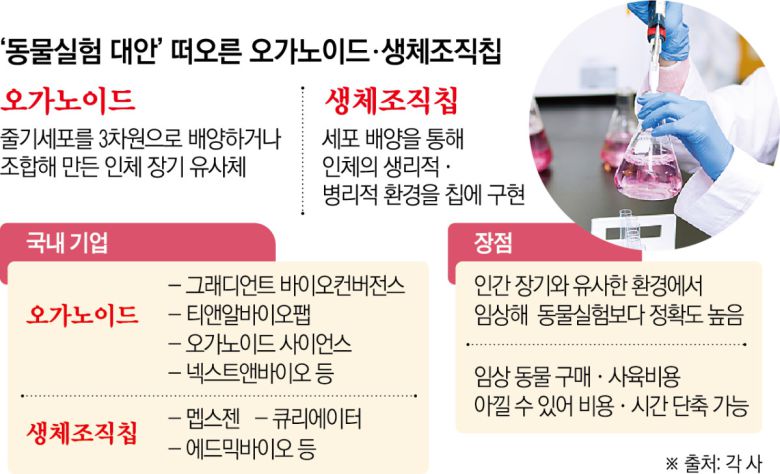 오가노이드와 생체조직칩은 인간의 장기와 유사한 환경을 만들어 임상하기 때문에 동물실험보다 정확도가 높다. 또 동물실험을 위해 영장류, 설치류 등 실험동물을 구매하고 사육해야 하는데 비용이 수십만 원에서 수천만 원에 달한다. 오가노이드와 생체조직칩은 임상용 동물 모델이 필요 없어 임상 비용과 시간을 단축할 수 있다.