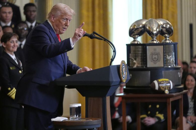 뉴욕 증시가 도널드 트럼프(가운데) 미국 대통령의 오락가락하는 관세정책에 대한 불안감 속에 15일(현지시간) 거래일 기준으로 사흘 만에 하락세로 방향을 틀었다. 이날 M7 빅테크 가운데 테슬라와 엔비디아만 상승했다. AP 뉴시스