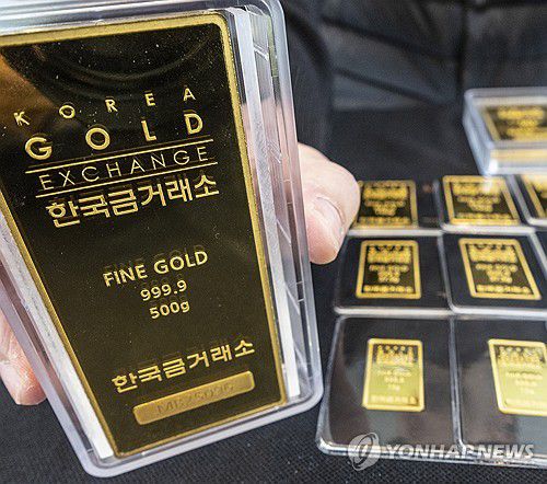 금값 상승세 지속(서울=연합뉴스) 황광모 기자 = 도널드 트럼프 미국 대통령의 관세정책 불확실성이 지속돼 달러화가 약세를 보이면서 국제 금값이 온스당 3천200달러대로 올라서며 사상 최고치를 다시 경신하고 있는 14일 서울 종로구 한국금거래소 종로 본점 직원이 진열된 골드바를 정리하고 있다. 2025.4.14 hkmpooh@yna.co.kr
