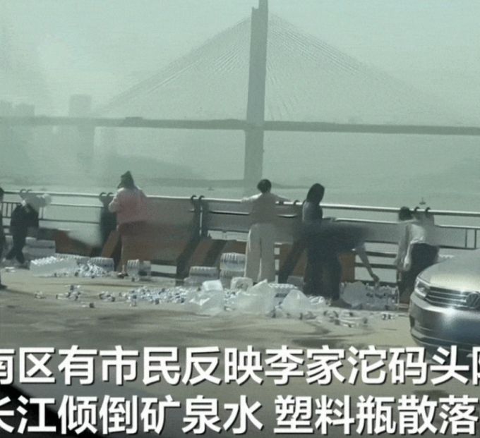 중국 매체 지무뉴스 등은 지난 14일(현지시간) 양쯔강의 한 다리 위에 모인 사람들이 대량의 생수를 강에 쏟아붓는 모습의 영상을 전했다.