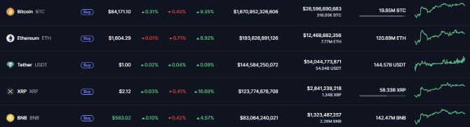 16일 글로벌 가상자산 시황중계 사이트 코인마켓캡에 따르면 이날 오전 6시 50분 기준 비트코인 가격은 24시간 전 대비 0.4% 하락한 8만 4171달러를 기록했다. 일주일 전과 비교하면 9.35% 올랐다. 알트코인(비트코인 외 가상자산)의 대표격인 이더리움은 전일 대비 0.71% 내린 1604달러에 거래됐으며, 리플(XRP)은 0.41% 하락한 2.12달러를 기록했다.