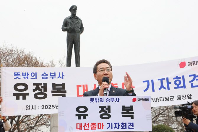 유정복 인천시장이 9일 인천 중구 자유공원 맥아더 동상 앞에서 제21대 대통령 선거 출마를 선언하고 있다. (사진=연합뉴스)