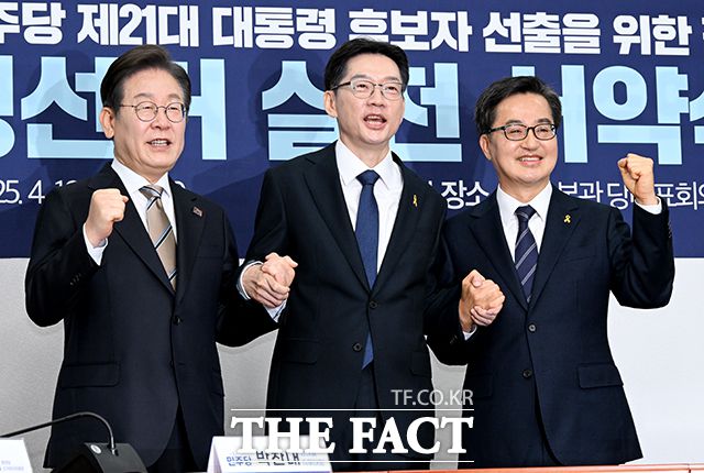 이재명 전 대표와 김경수 전 경남지사, 김동연 경기지사 등 세 명의 경선 후보들은 16일 국회 본청에서 열린 민주당 공명선거 실천 서약식에 참석했다. 기호는 이 전 대표가 1번, 김 전 지사가 2번, 김 지사가 3번이다.