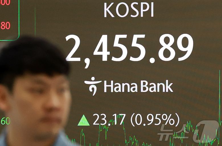 14일 오후 서울 중구 하나은행 본점 딜링룸 전광판에 증시가 표시되고 있다. 이날 코스피 지수는 전 거래일 대비 23.17p(0.95%) 상승한 2455.89로 마감했다. 2025.4.14/뉴스1 ⓒ News1 김진환 기자