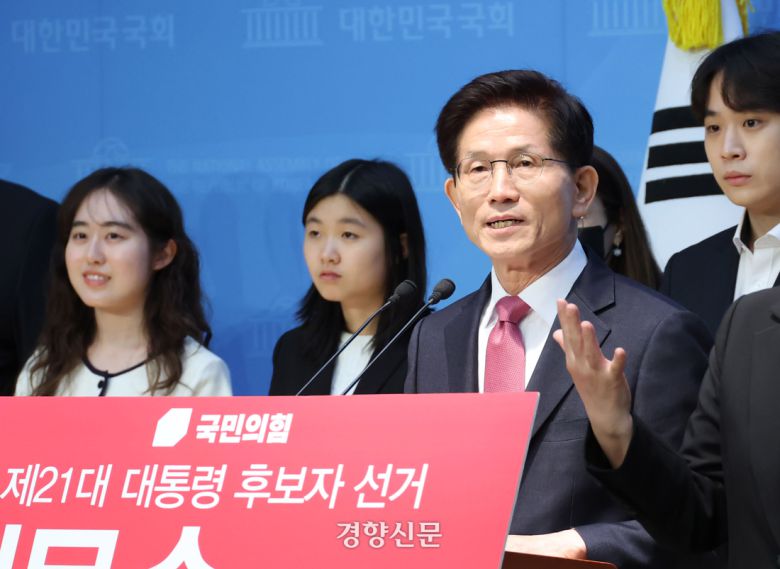 김문수 국민의힘 대선 경선 후보가 16일 국회 소통관에서 제21대 대통령 경선 후보 출마 선언을 하고 있다. 한수빈 기자 |
