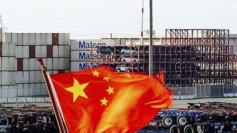 ▲ 15일 미국 캘리포니아주 오클랜드 항구에 정박한 배에 중국 국기가 걸려있다.