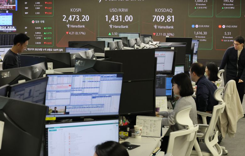 16일 오전 서울 중구 하나은행 본점 딜링룸 현황판에 코스피, 원/달러 환율, 코스닥 지수가 표시돼 있다.  이날 코스피는 전장보다 4.63포인트(0.19%) 내린 2472.78로 출발했다. /연합뉴스