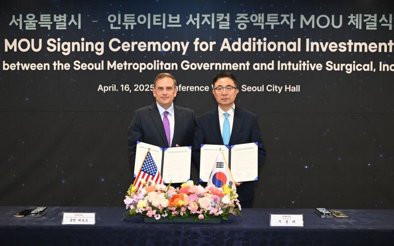 서울시는 16일 시청 본관에서 美 수술 로봇 기업 ‘인튜이티브 서지컬’과 150억원의 증액 투자 및 신규 고용 등을 내용으로 한 양해각서(MOU)를 체결했다고 밝혔다.