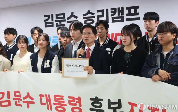 [서울=뉴스핌] 이호형 기자 = 김문수 전 고용노동부 장관이 15일 오전 서울 여의도 캠프 사무실에서 열린 대학생,김문수 대통령 후보 지지 선언 기자회견에 참석해 발언을 하고 있다. 2025.04.15 leemario@newspim.com |