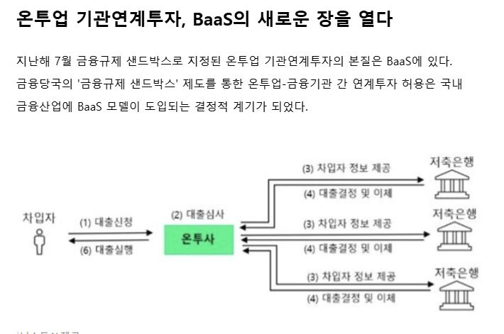 지난해 7월 금융 규제 샌드박스로 지정된 온투업 기관 연계 투자는 BaaS 모델 확산의 기폭제 역할을 하며 금융 혁신의 새로운 장을 열었다는 평가를 받는다. 금융 당국의 '금융 규제 샌드박스' 제도를 통한 온투업-금융 기관 간 연계 투자 허용은 국내 금융 산업에 BaaS 모델이 본격적으로 도입되는 결정적인 계기하는 설명이다.