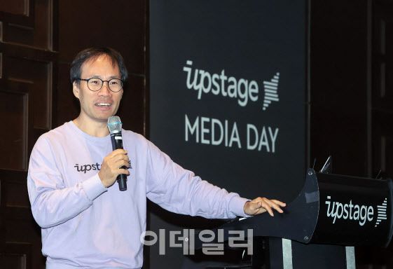 김성훈 업스테이지 대표가 ‘한국 대표로 아시아를 넘어 글로벌 톱 AI 기업’으로 성장 계획을 발표하고 있다(사진=업스테이지)