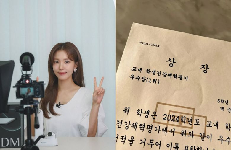 공개된 사진 속에는 정시아의 아들 준우 군이 중학교 3학년 당시 교내 학생건강체력평가에서 우수상 1위를 수상한 상장이 담겨 있었다.