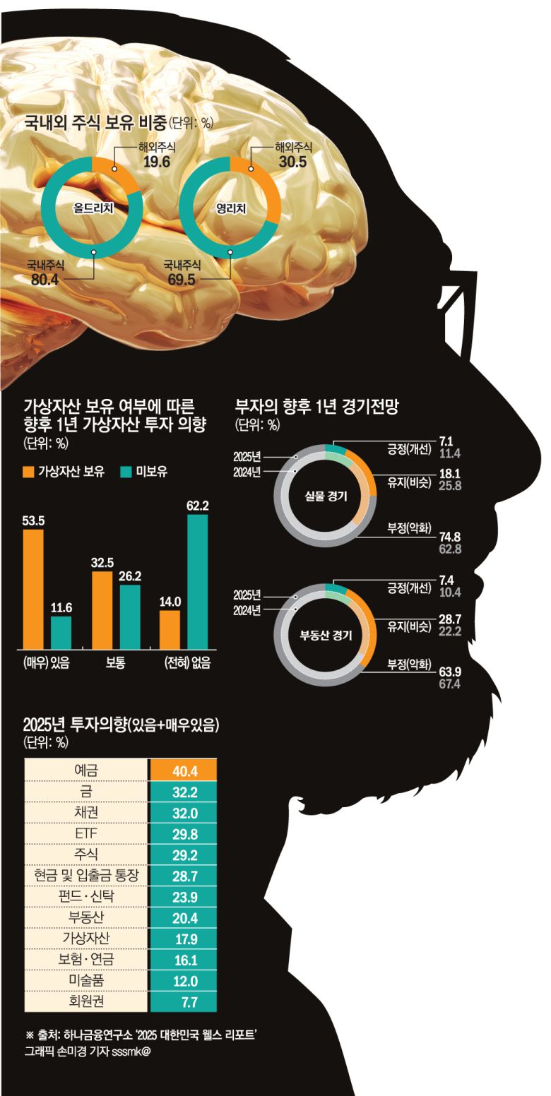하나금융연구소는 16일 금융자산 10억 원 이상을 보유한 '부자' 884명과 1억~10억 원 미만 '대중부유층' 1545명, 1억 원 미만 '일반대중' 581명 등 총 3010명의 자산관리와 투자행태를 분석한 이러한 내용의 '2025 대한민국 웰스 리포트'를 발간했다.