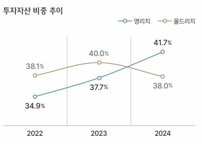 영리치는 지난해 금융자산의 42%를 투자자산으로 운용하고 있었다. 2023년 37.7%보다 4%p가량 올랐다. 투자자산 비중이 2023년 40%에서 지난해 38%로 떨어진 올드리치와 대조적이다. 영리치 10명 중 2명은 가능성이 있다면 대출을 해서라도 투자자금을 만들려는 의지도 보였다.